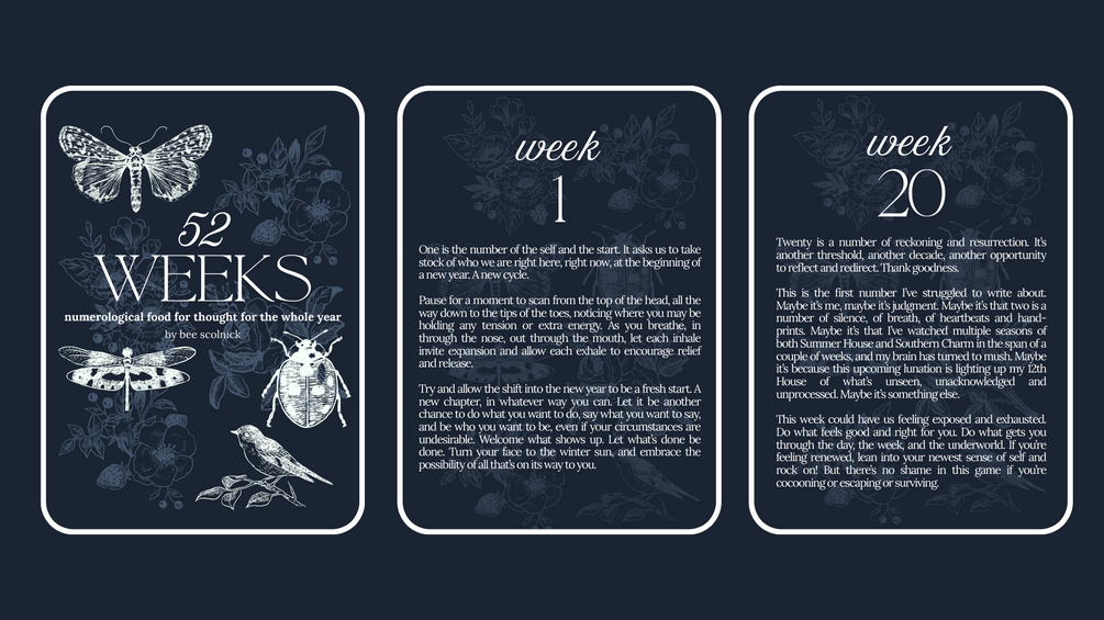 An immediate PDF download of "52 WEEKS: Numerological Food for Thought for the Whole Year" by bee scolnick.